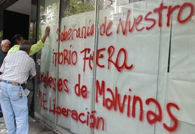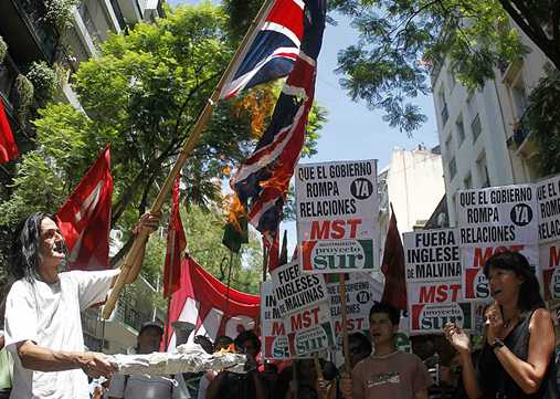 El martes de esta semana se produjo una manifestación frente a la embajada británica, en el barrio de Recoleta. Grupos de jóvenes afines al kirchnerismo y Proyecto Sur protestaron e incendiaron una bandera de Gran Bretaña