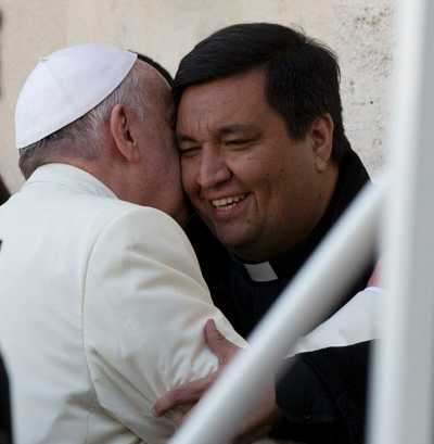 El miércoles 8 de enero, el Papa Francisco realizó la primera audiencia de 2014 y luego, cuando hizo su habitual recorrido en el Papamóvil, por la Plaza San Pedro, divisó entre la gente al Padre Fabián, de la Basílica del Pilar, a quien reconoció e inmediatamente lo invitó a subir con él al vehículo