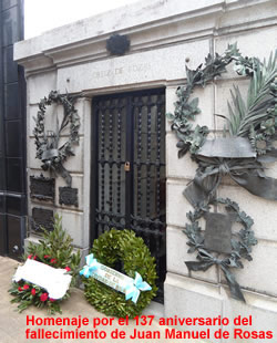 Al cumplirse el 137 aniversario del fallecimiento del Brigadier General Don Juan Manuel de Rosas se realizó un Acto Conmemorativo organizado por el Instituto Nacional de Investigaciones Históricas "Juan Manuel de Rosas" en la bóveda donde descansan sus restos