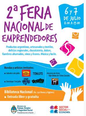 El sábado 6 de julio y el domingo 7 se llevará a cabo la 2º Feria Nacional de Emprendedores en la Biblioteca Nacional (Av. Las Heras y Agüero), de 11 a 19 horas, organizado por el Sector Social de la Economía, del Ministerio de Trabajo, Empleo y Seguridad Social de la Nación.