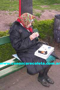 En la plaza Int. Alvear se puede ver gente tomando sol, escuchando música, mateando y en este caso la abuela tejiendo.